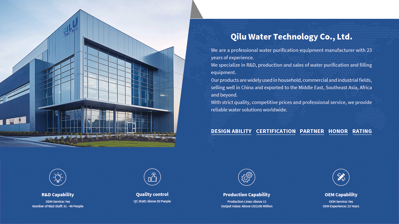 A professional water purification equipment company with 10 years of experience in water purification equipment manufacturing. We are committed to researching, producing, and selling advanced water purification systems and supporting water equipment. Our products include water purifiers, pure water vending machines, liquid filling machines, purified water filling production lines, blow molding machines, etc., which are widely used in commercial, household, industrial and other fields. Our business scope not only covers many cities in China, but also exports our products to the Middle East, Southeast Asia, Africa, and other countries. Due to our adherence to strict quality standards, reasonable prices, and professional pre-sales and after-sales services, we sincerely hope that more customers can benefit from our solutions.